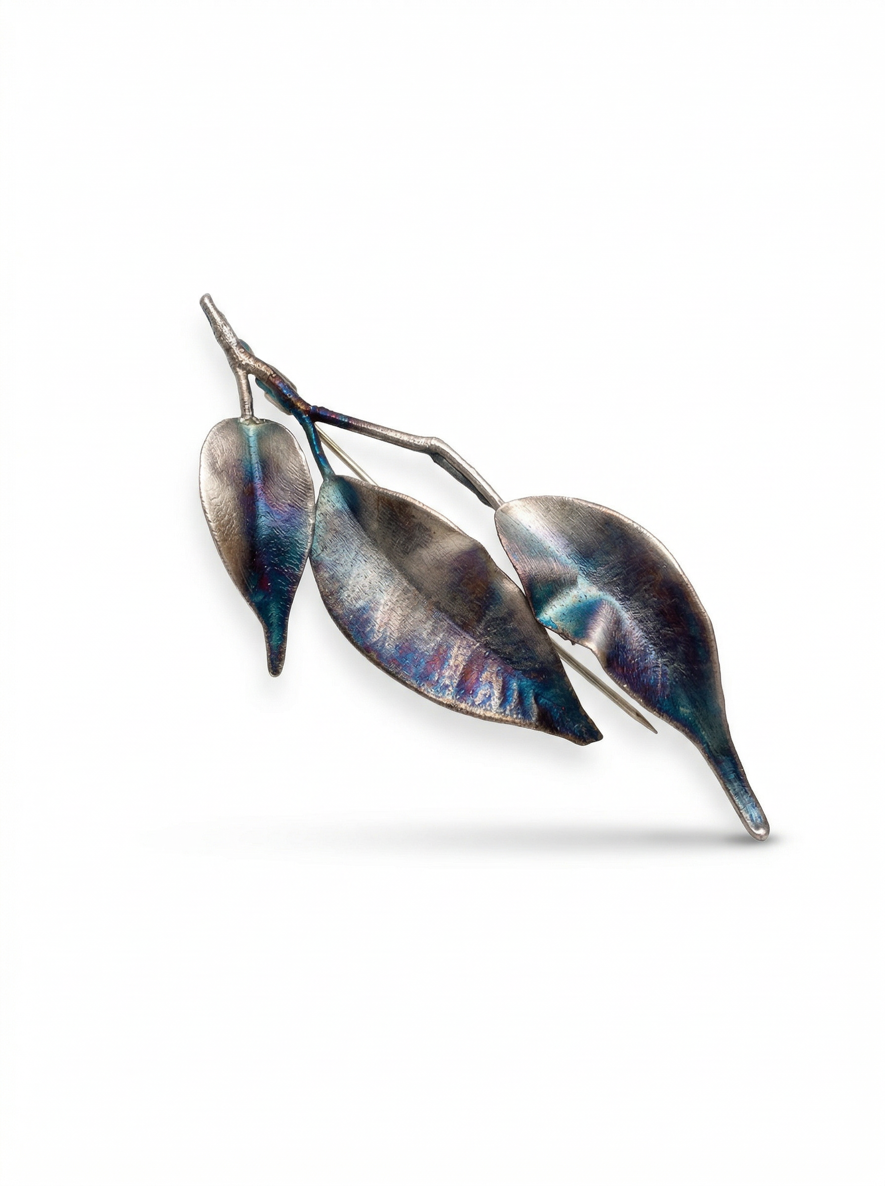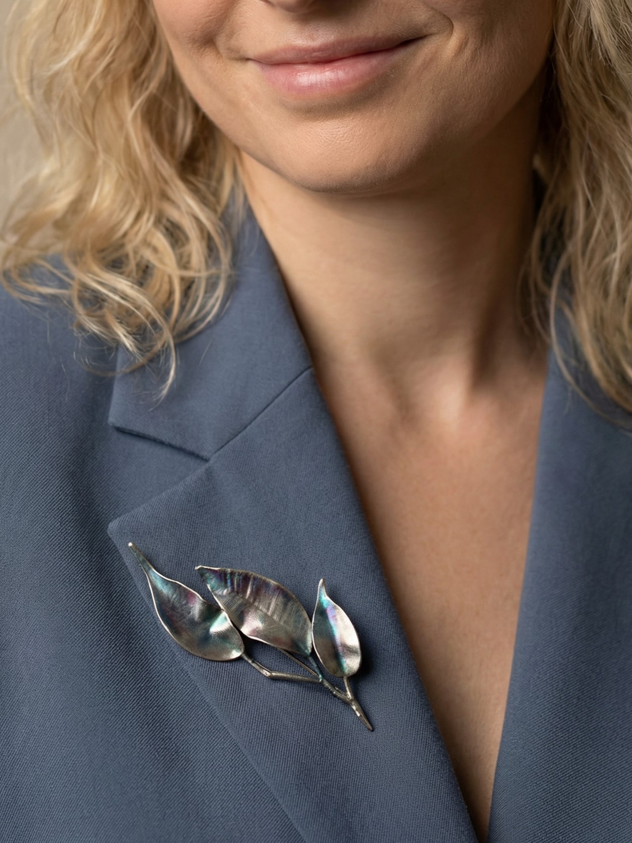 W tej broszce zachowaliśmy prawdziwy liść fikusa beniaminka. Dzięki procesowi galwanizacji jego naturalna struktura została utrwalona w metalu, co pozwoliło zachować wszystkie detale rośliny.