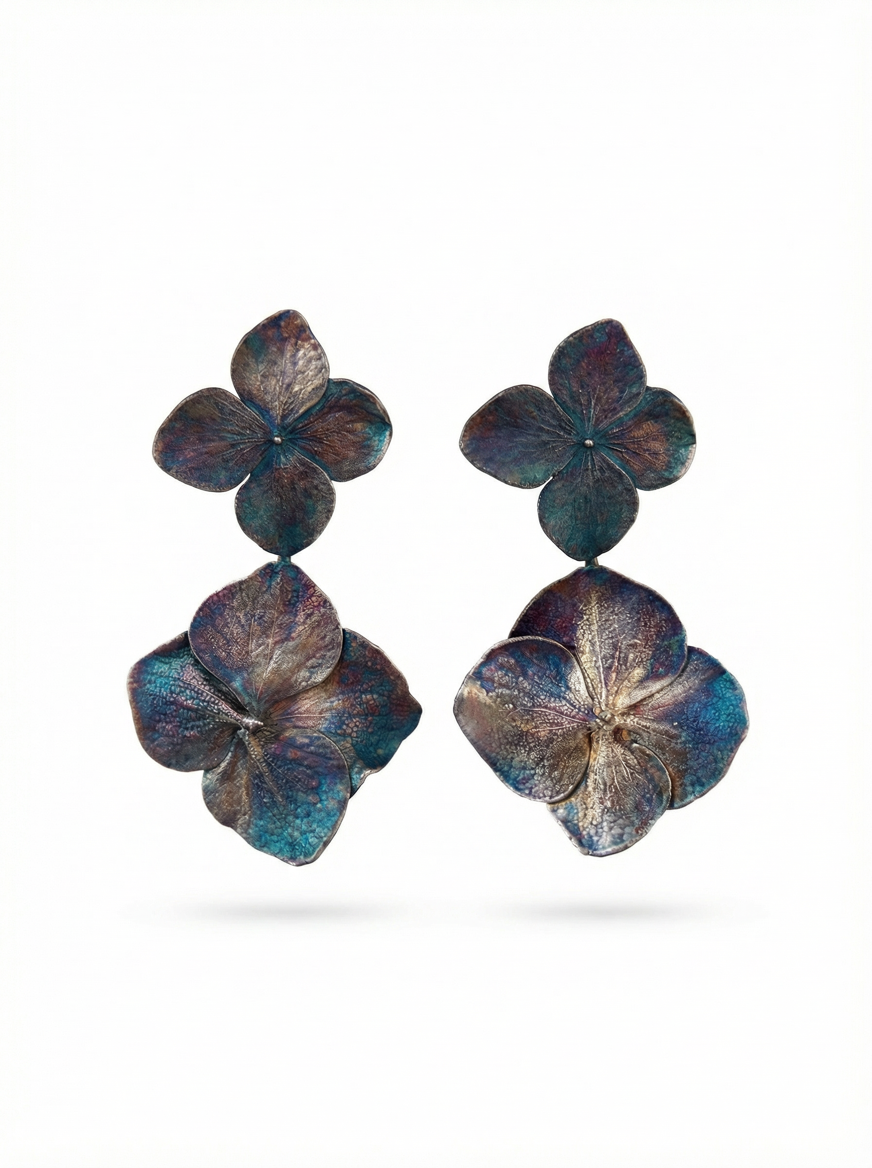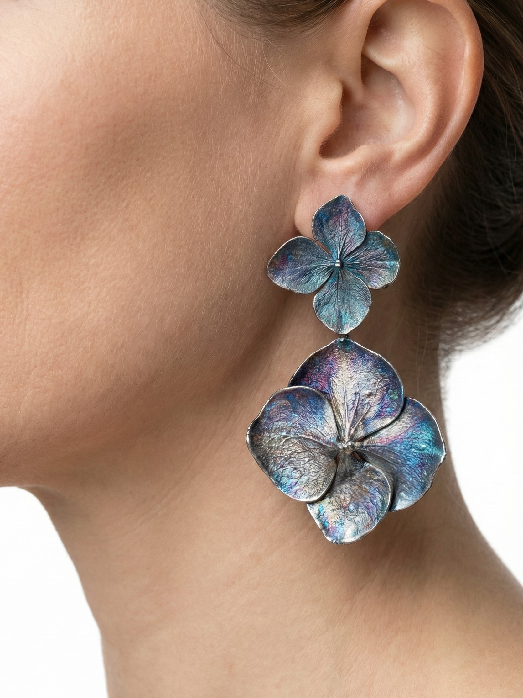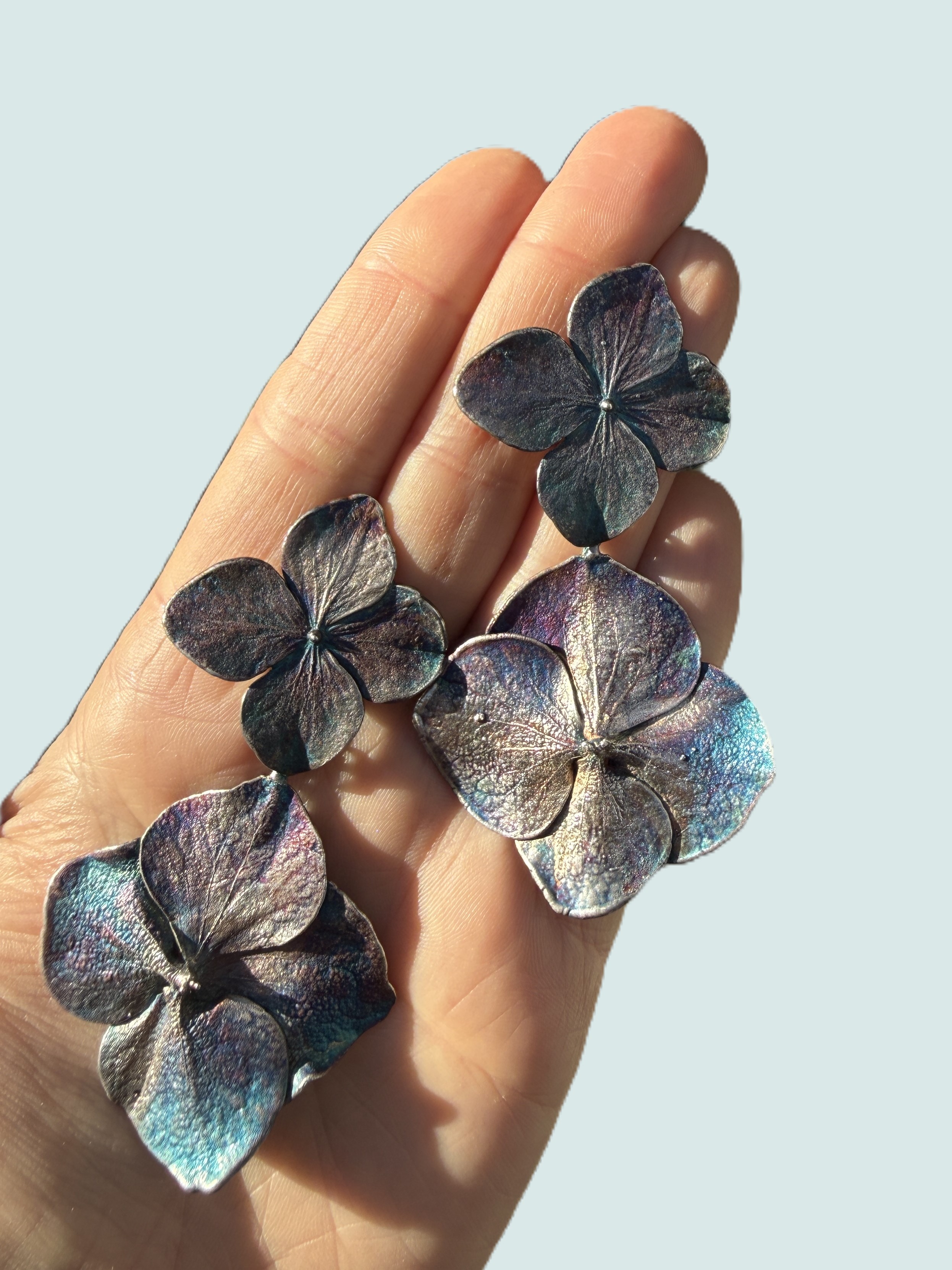W tych kolczykach zachowaliśmy prawdziwe kwiaty hortensji. Dzięki procesowi galwanizacji ich naturalna forma została utrwalona w metalu, co pozwoliło zachować wszystkie detale płatków.