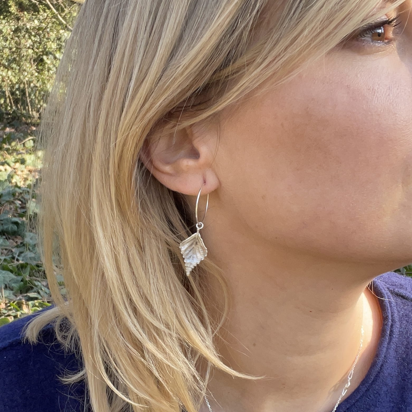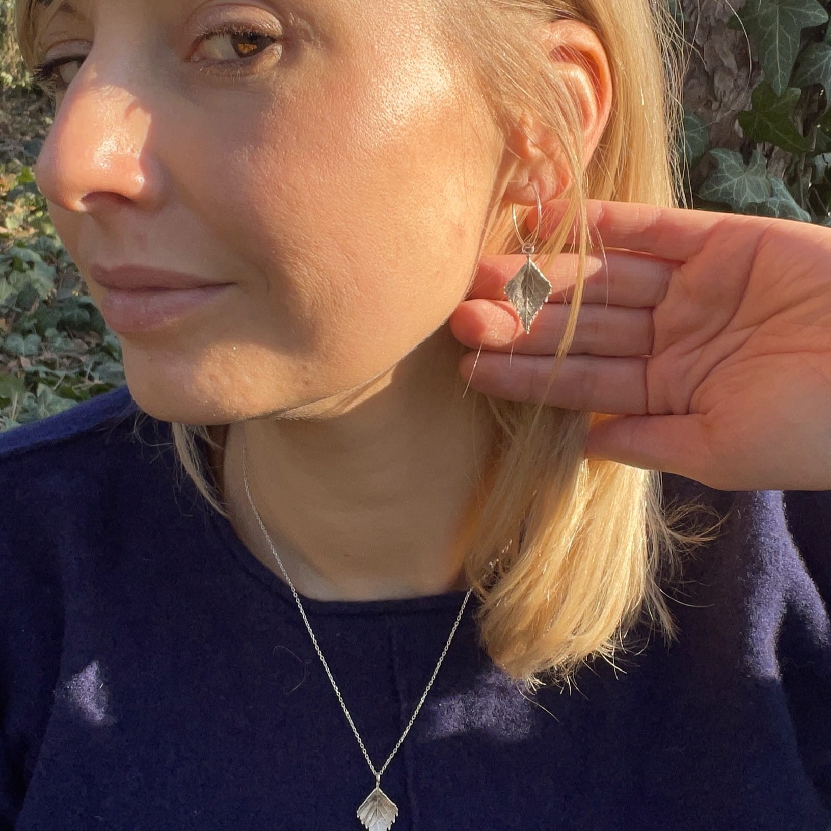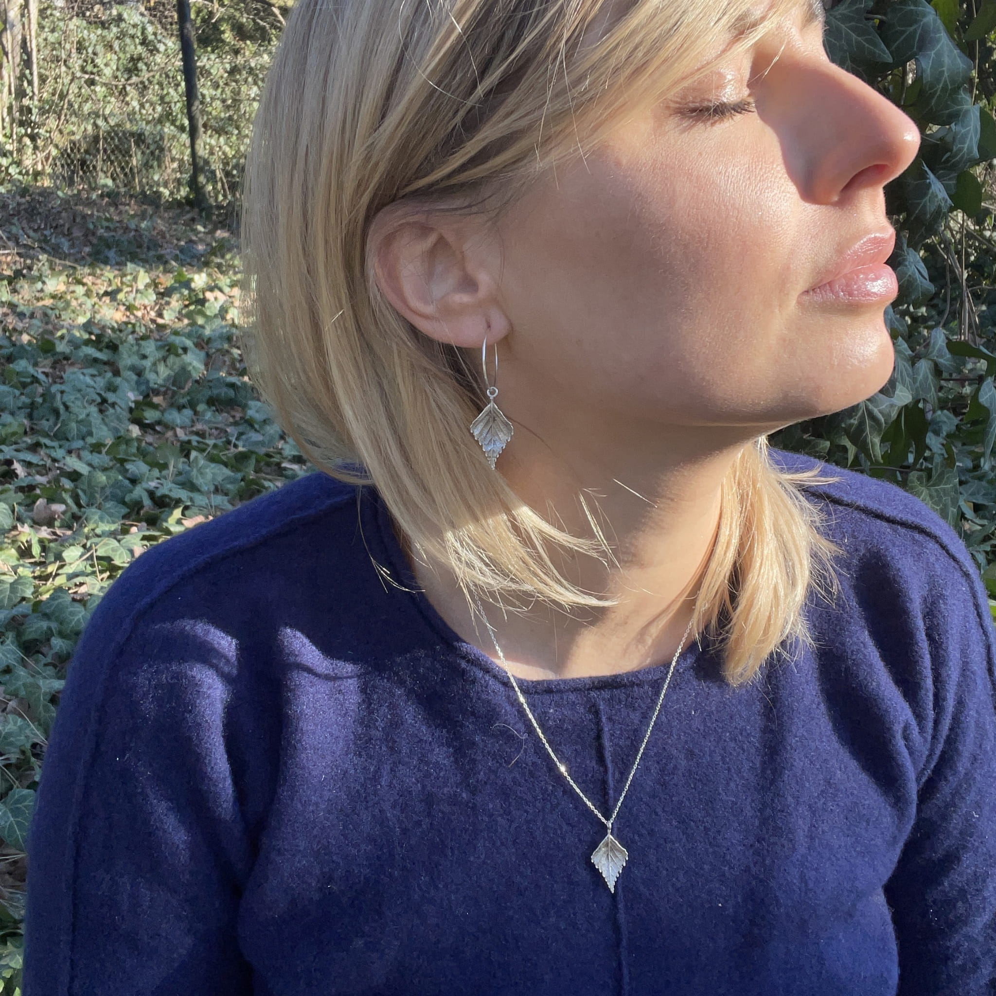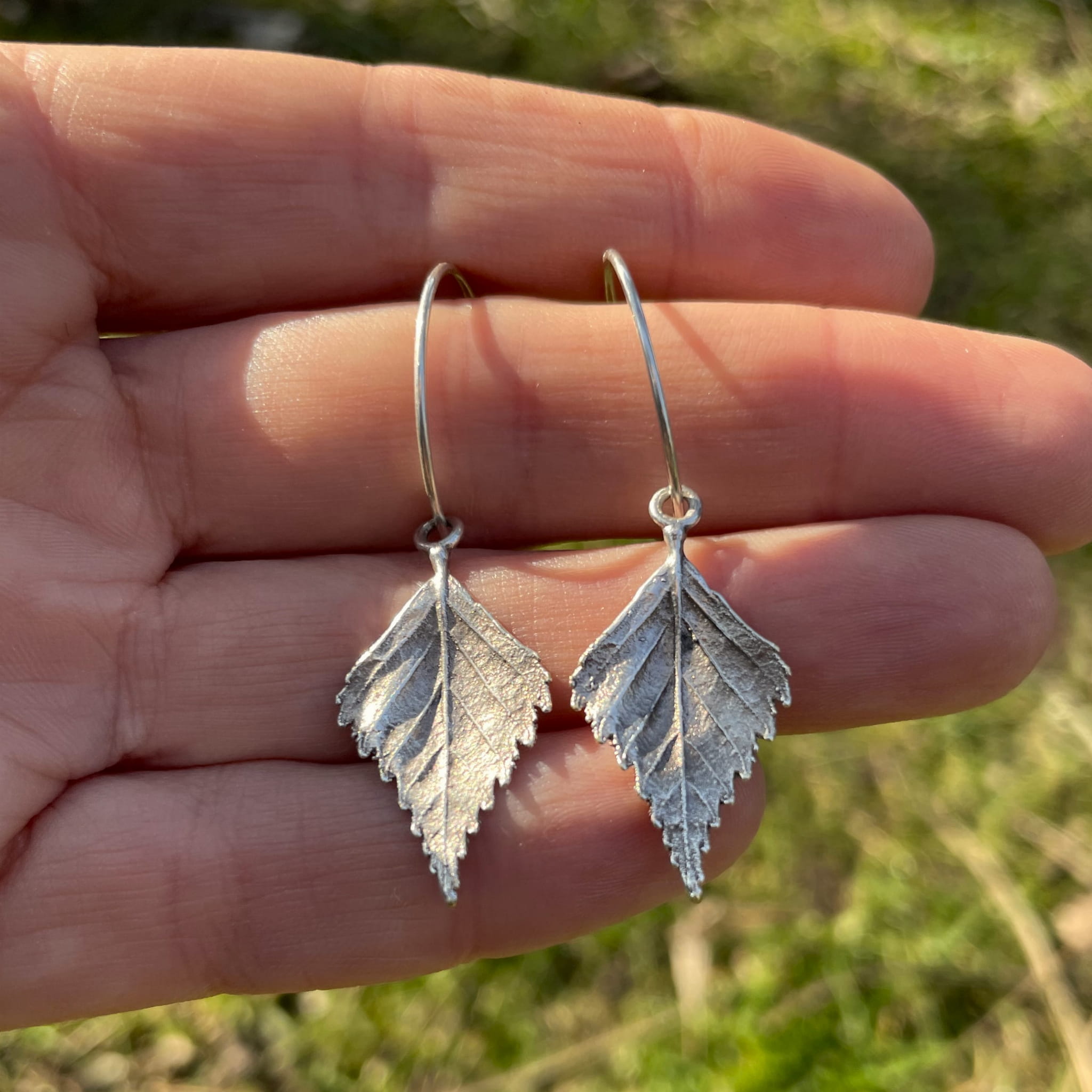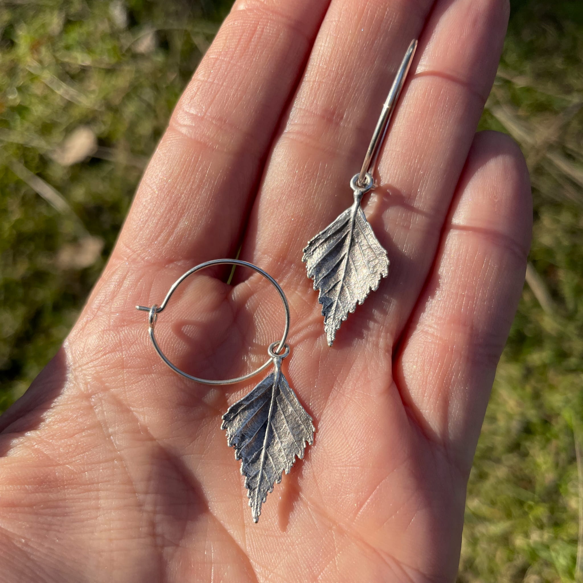 Kolczyki są artystycznym rękodziełem, które charakteryzuje stosowanie autorskich technik wykonania. Wnętrze wyrobu wykonane jest z mosiądzu jubilerskiego na bazie prawdziwych listków brzozy (2,5 cm długości). Wierzchnia warstwa zaś pokryta jest czystym oksydowanym srebrem. Kolczyki są lekkie i komfortowe w noszeniu.